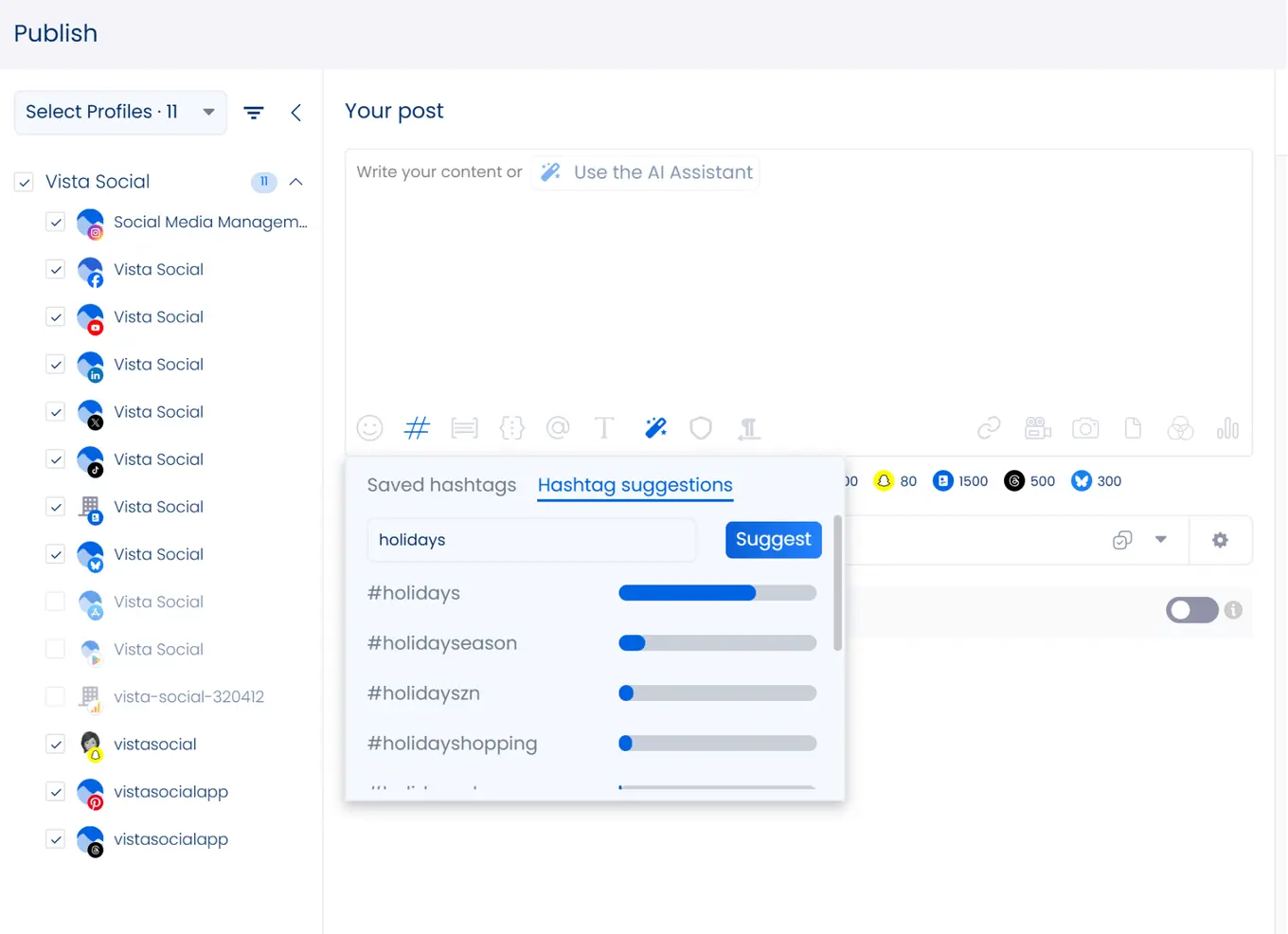 - Find relevant and popular hashtags in your clients’ industry or niche based on specific topics and keywords in a flash to boost their content’s searchability and chances of getting featured by the algorithm. Use Vista Social’s free AI hashtag generator for social media to get hashtag suggestions in seconds.