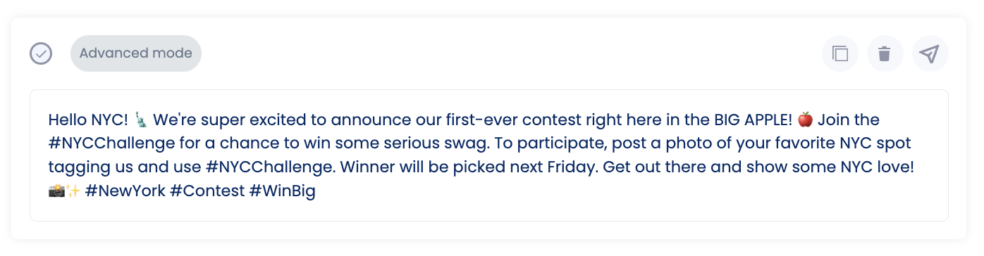 - Content Variation: Use the AI Assistant to tweak your messages. For instance, if you’re running a promo or contest in a specific location, prompt it with, “Generate an Instagram post about a contest for people in New York”, to get content that hits the mark.