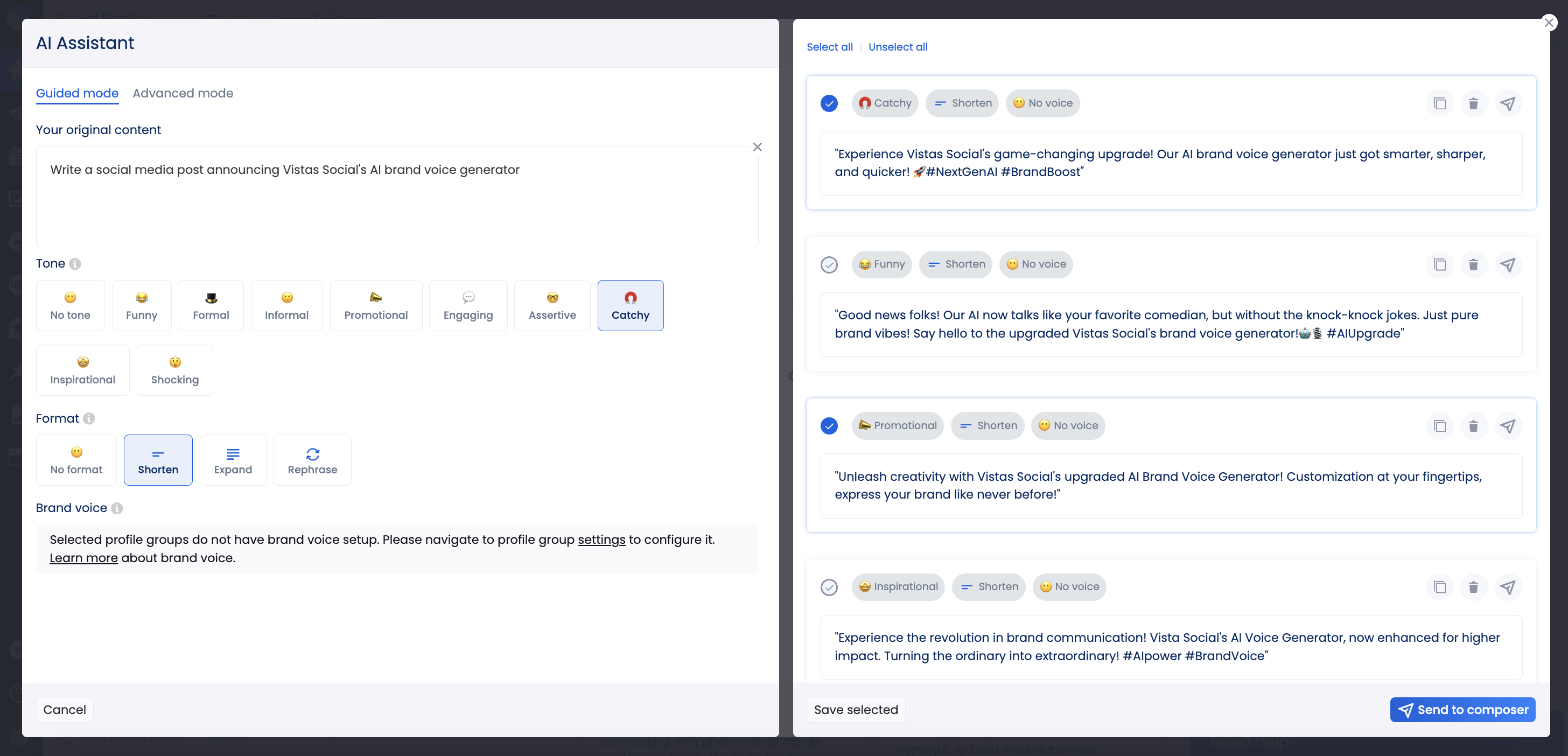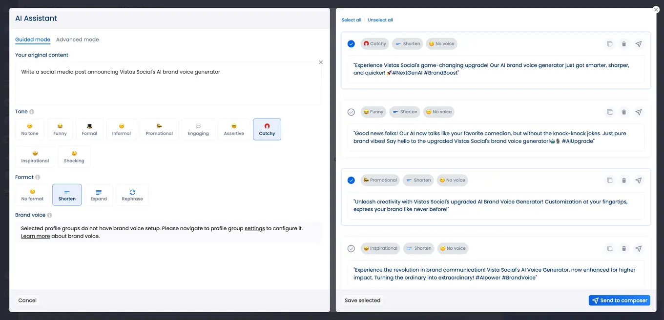 - Consistency Across Profiles: Ensure uniformity in voice adaptation by setting a predefined brand voice for each profile group. This way, no matter the post, your content stays true to the targeted demographic’s tone.