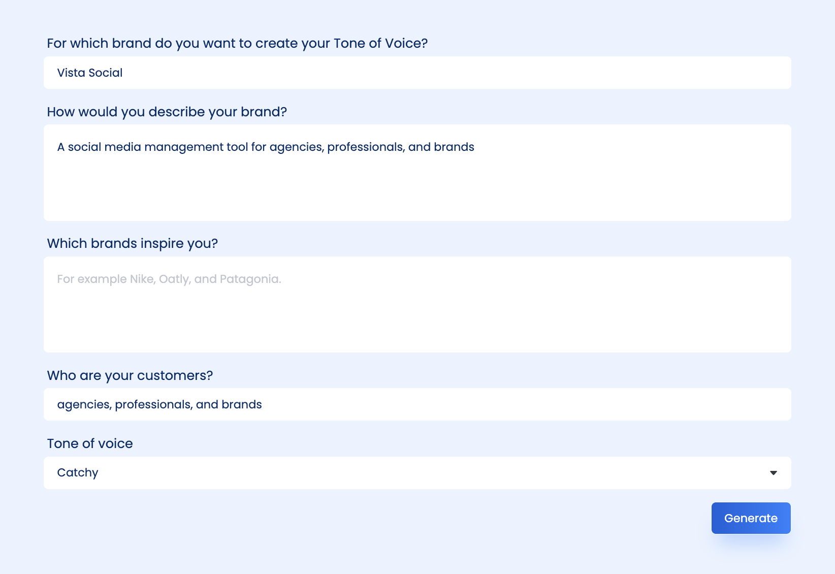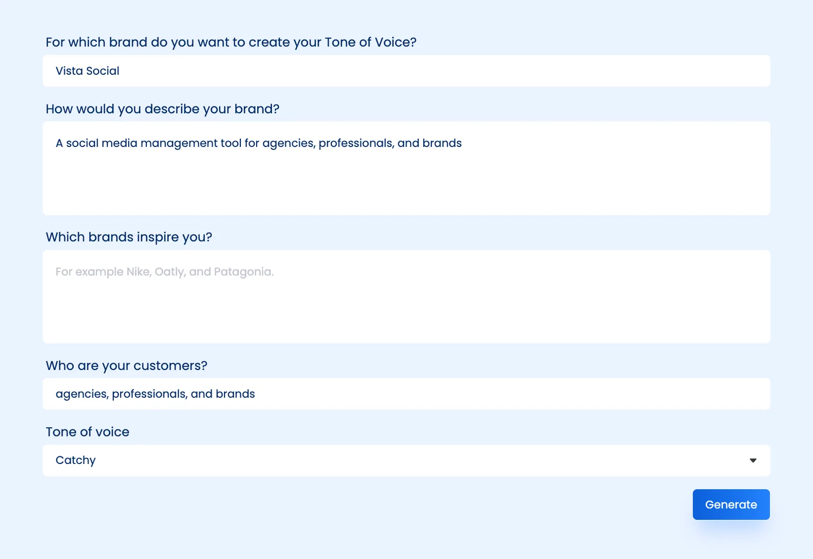 - Free Brand Voice Generator: Just starting to figure out your brand voice? Don’t sweat it. Vista Social’s free brand voice generator is here to help–just drop in some details about your brand and audience, and boom, you’ll get a personalized voice guide.