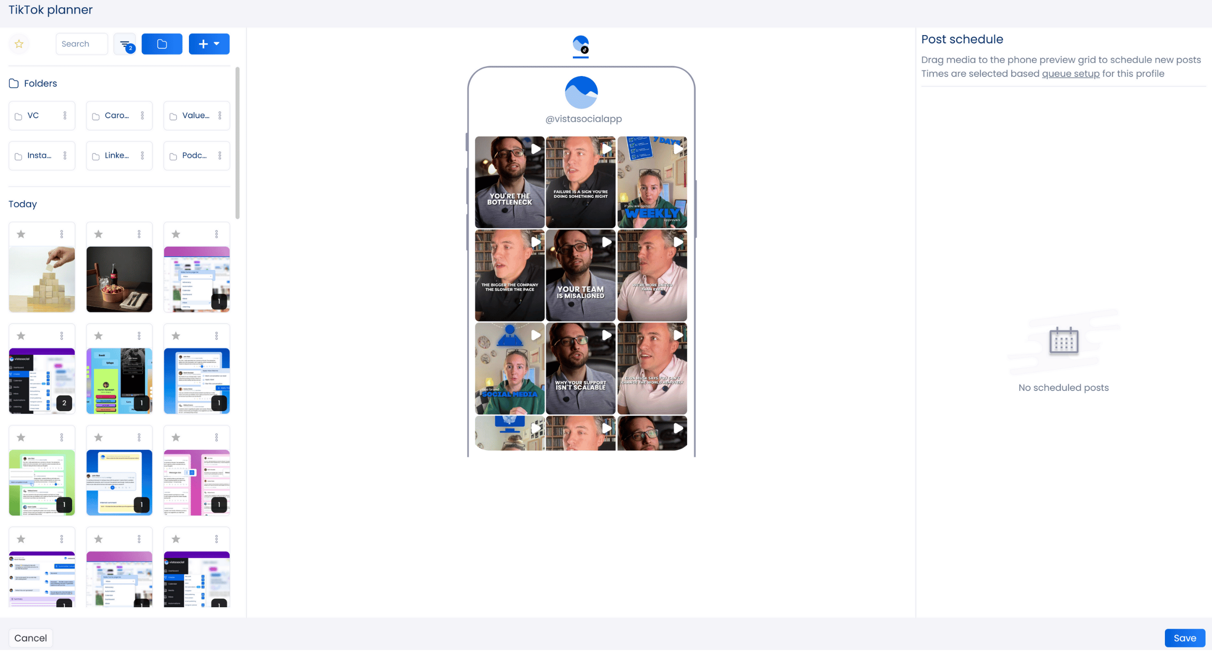 Use Vista Social’s drag-and-drop Visual TikTok Planner to: