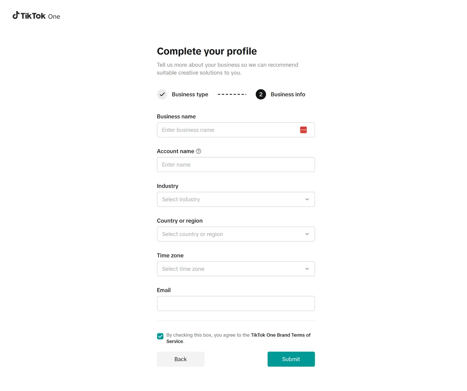 Click ‘Submit’ at the bottom of the registration form to finish creating your TikTok Creator Marketplace account.