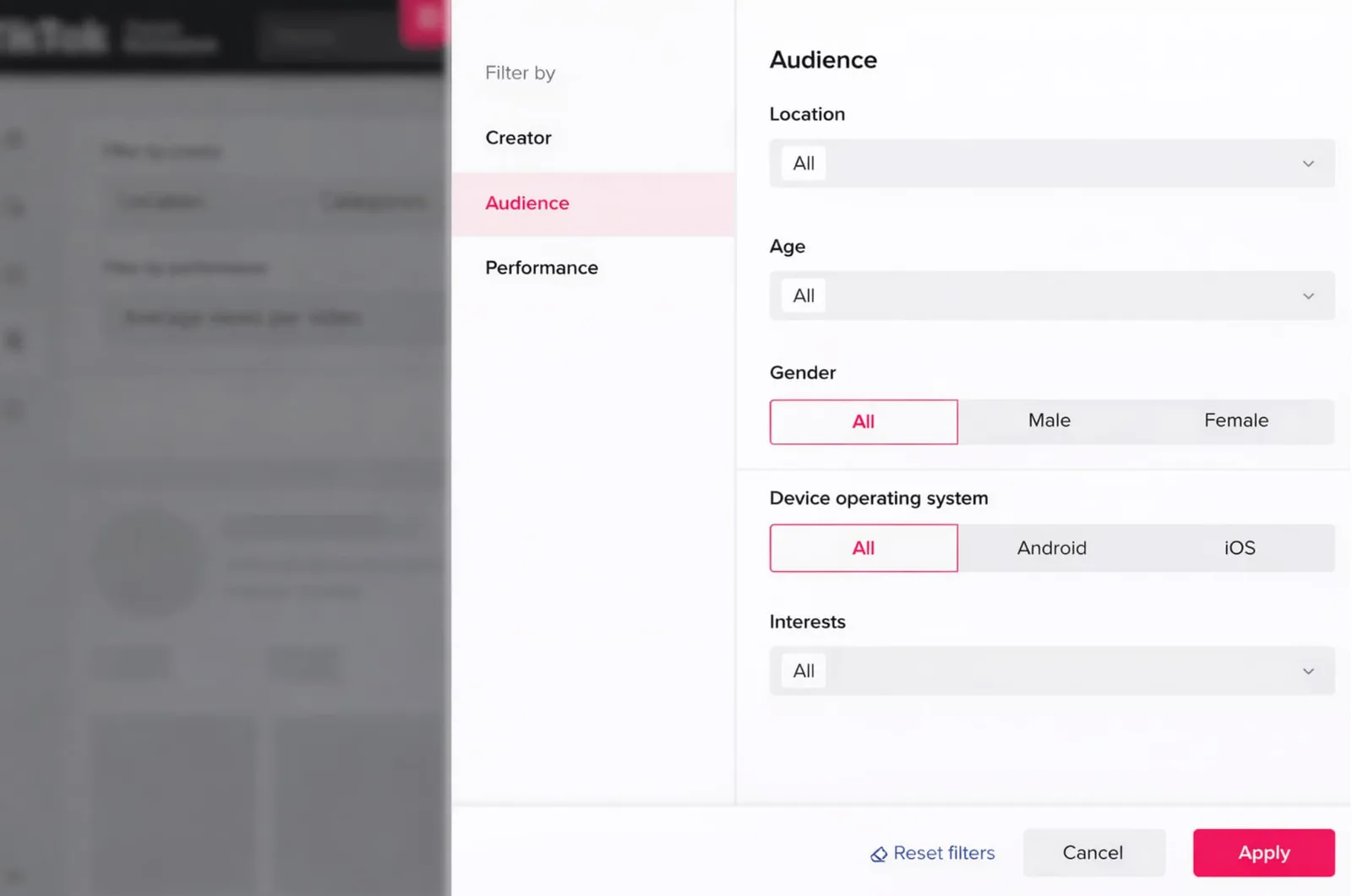 Under “Interests,” select relevant niches that position your brand or product to the right audience. Be as specific as possible to narrow down your campaign’s target audience and maximize your TikTok influencer marketing budget.