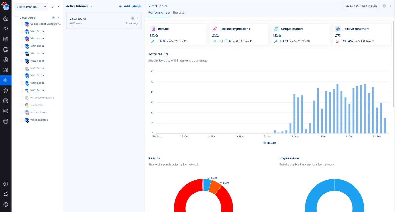 Vista Social Listening feature makes it easy to track mentions of your brand product platform. From the dashboard, go to “Listening” and click ‘Add Listener.’