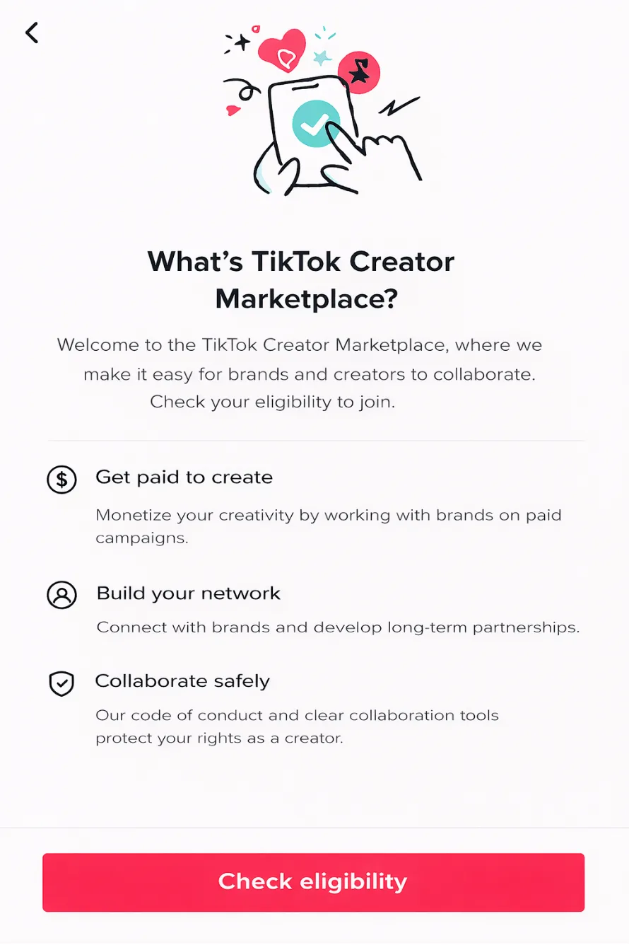 Tap ‘Creator Marketplace’ under “Creator Next.” On the TikTok Creator Marketplace page, tap ‘Check eligibility’ to verify if you’re qualified to join.