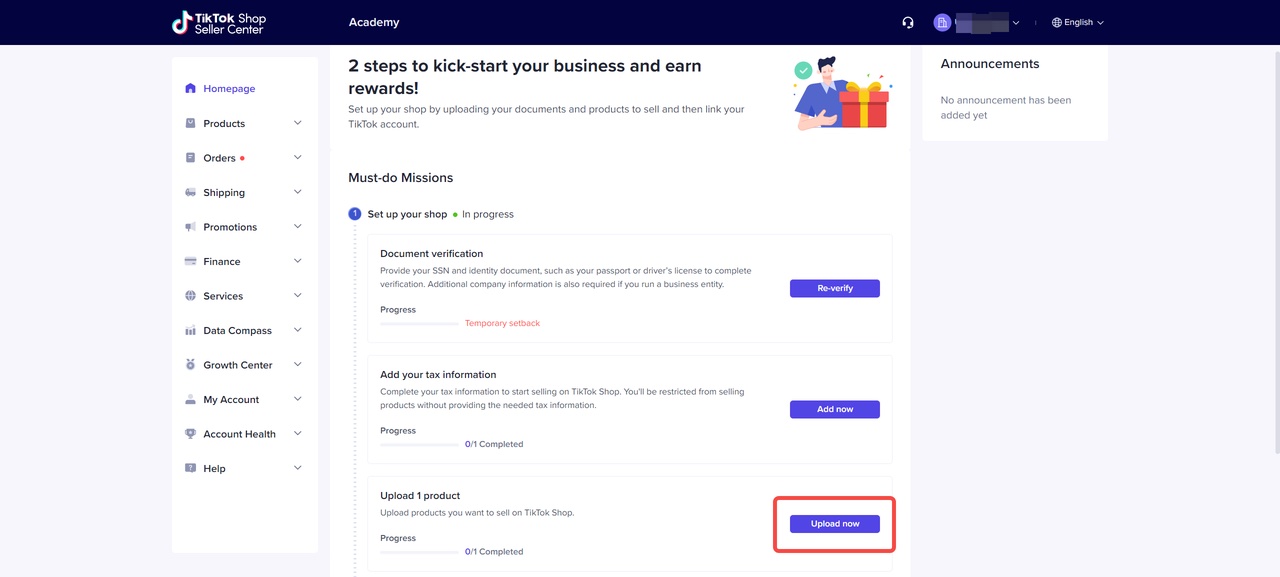 To get your TikTok Shop rolling, click the “Upload Now” button to introduce your inaugural product.