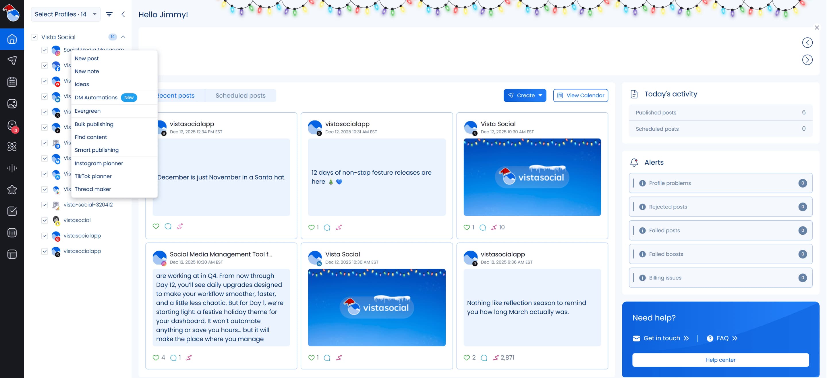 First, you need a platform that can function as a central hub for all your social media marketing efforts. Vista Social helps you manage campaigns across today’s most important social platforms from one place. It supports consistent posting, improves visibility through clear performance insights and makes it easier to stay connected with your audience as conversations happen.