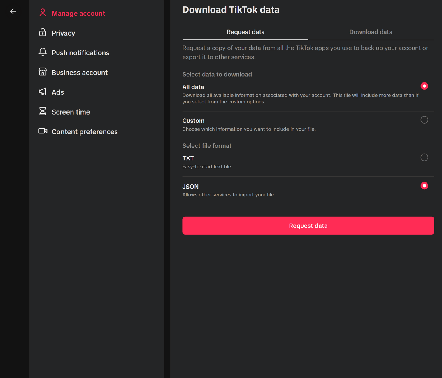 Under Request data, choose the JSON file format and click Request data at the bottom.