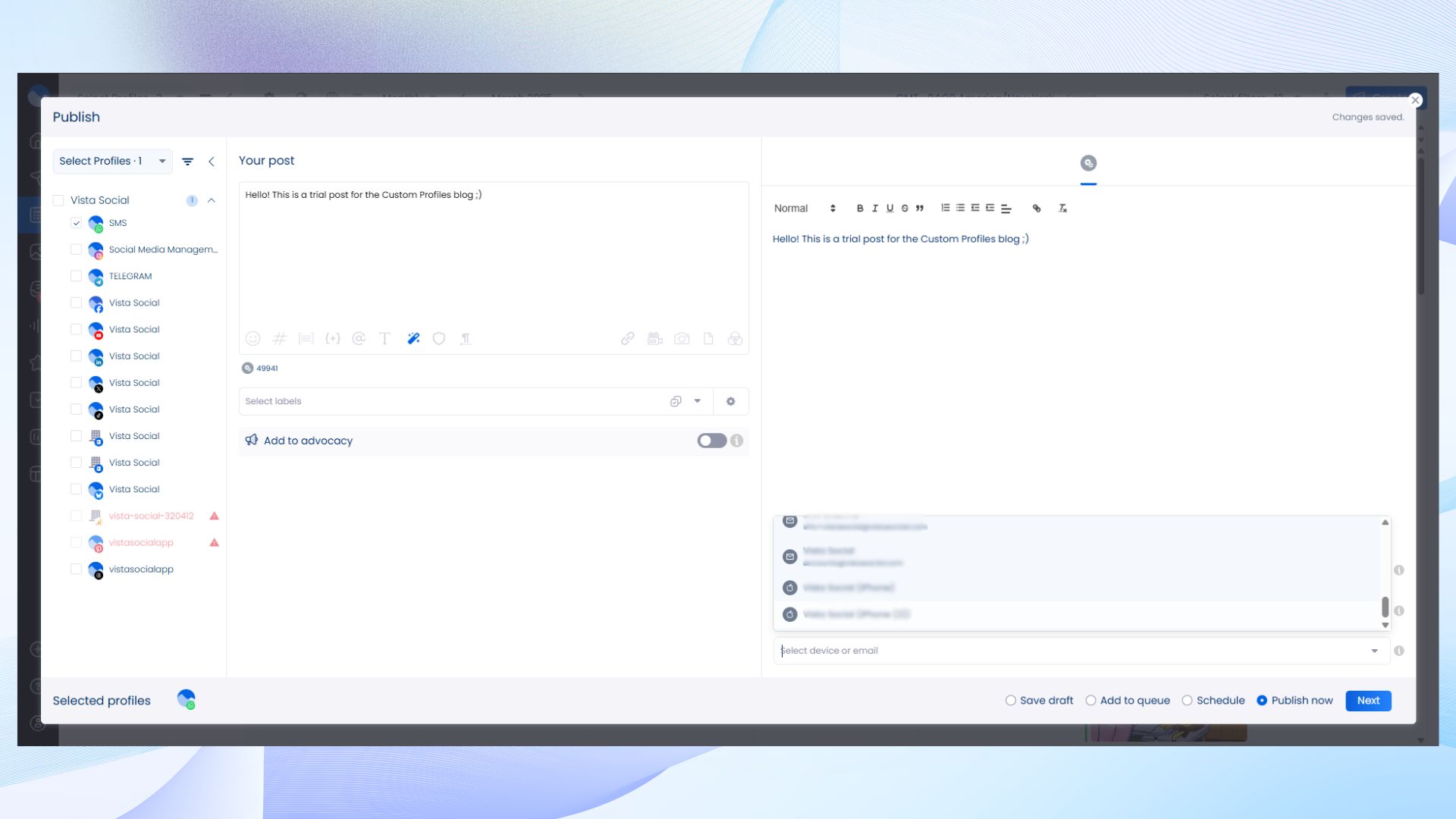 With Custom Profiles, Vista Social’s calendar becomes a true marketing command center. Everything is in one place, making multi-channel coordination easier than ever.