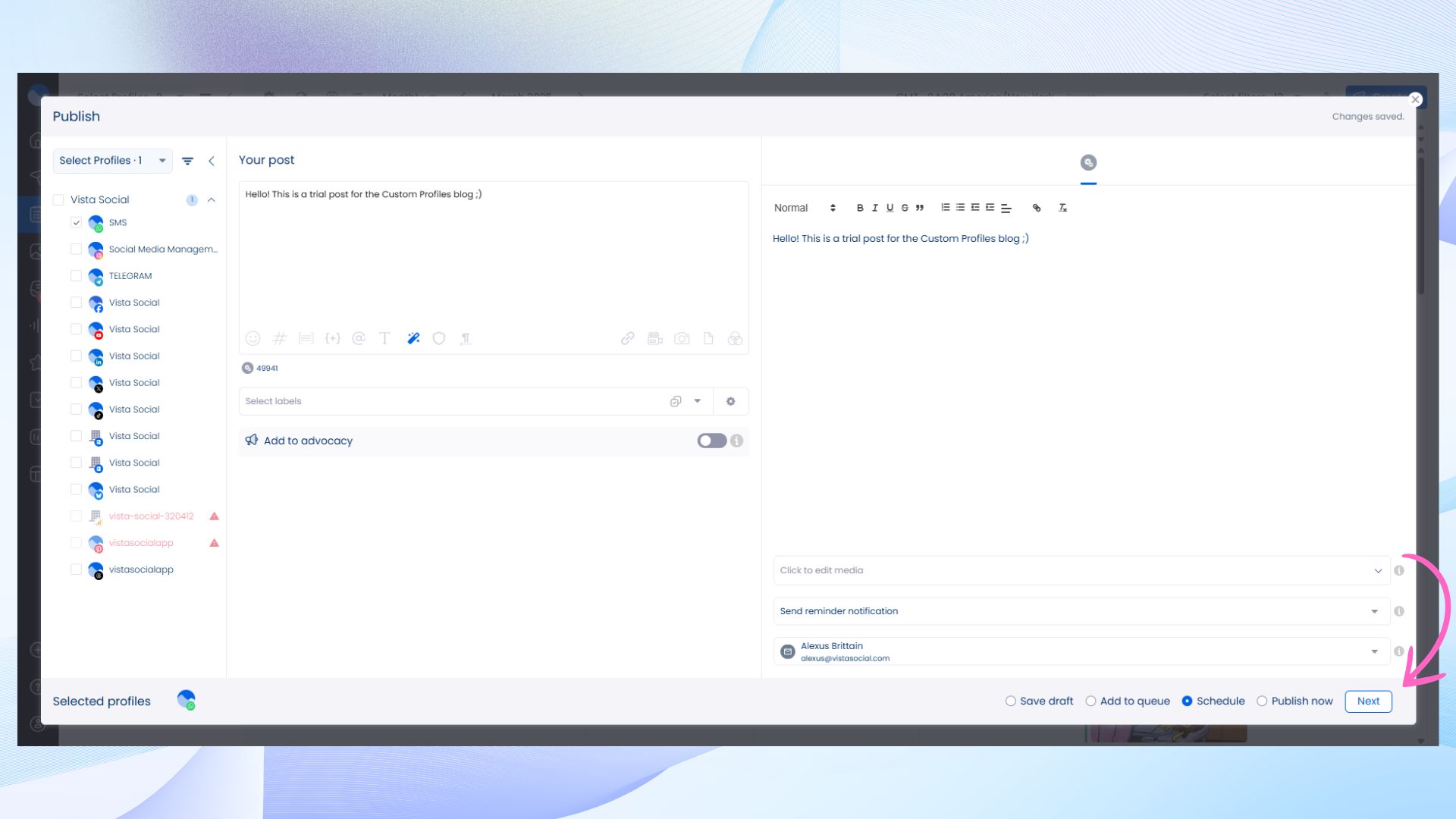 Not everything can be automated. Sometimes, a blog needs to be manually published, a report needs to go live, or a sales deck needs to be updated. With Custom Profiles, you can set reminders for these tasks just like you would for social posts. At the right time, Vista Social sends a notification to the right person, making sure everything stays on track.