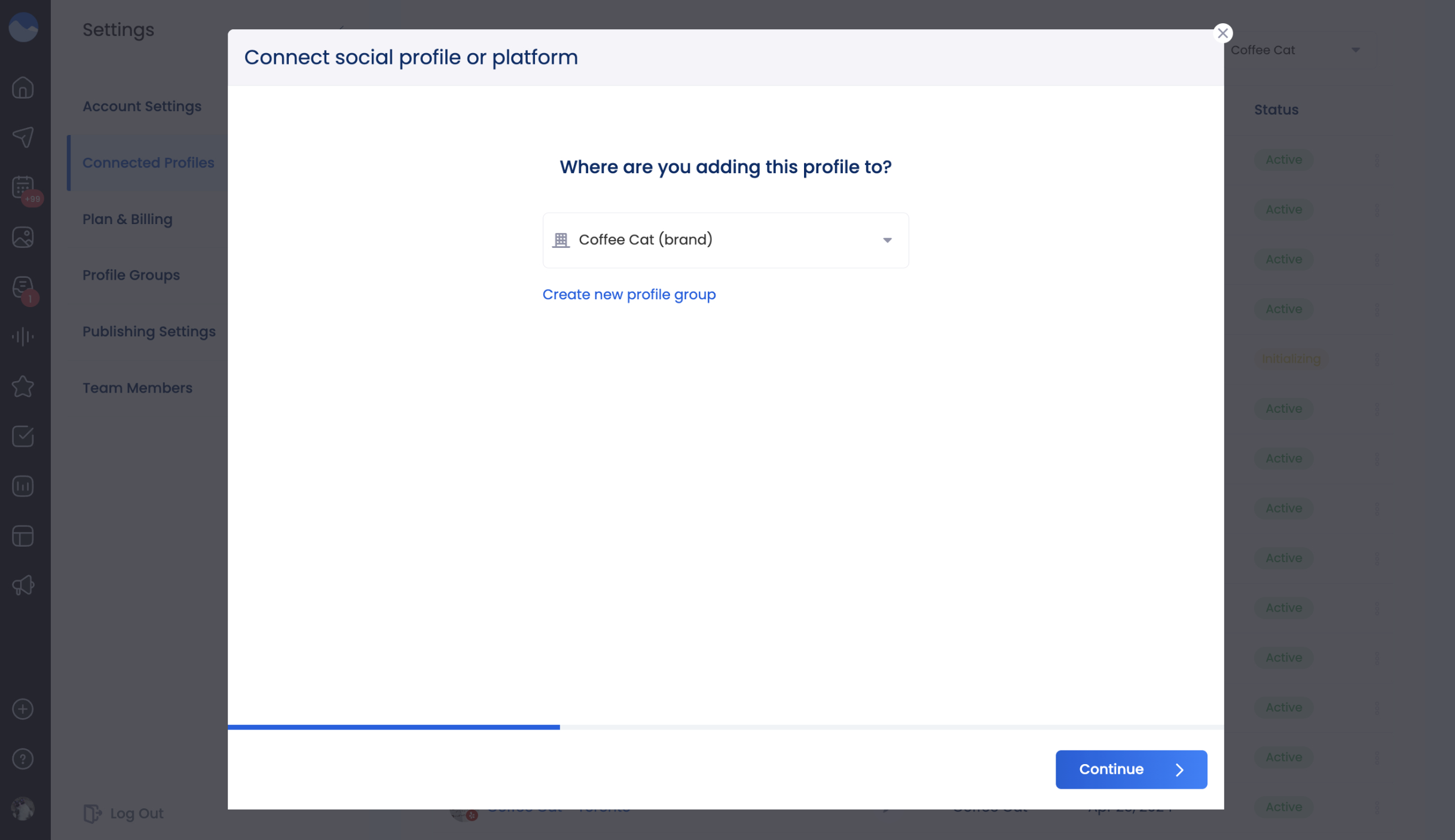 2. Choose a profile group to add the profile to. You may create a new one if the profile group is not on the list yet. Click Continue.