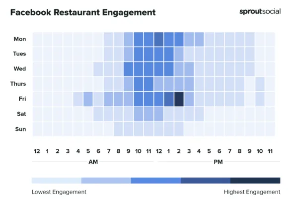 No doubt, your restaurant’s profile is an effective tool for attracting and winning a new audience. Competent account promotion will give you a unique opportunity to master a new market, attract a new audience, and reach a new development level. Below we have listed the optimal times according to Sprout Social’s data. To determine your best posting time, check out your statistics and track specific hourly activity indicators for each day of the week.