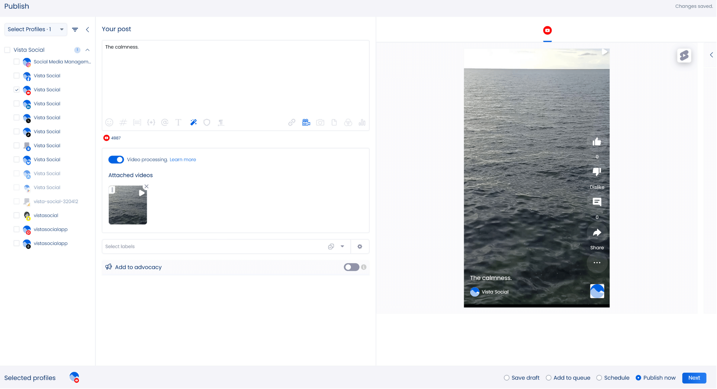 Schedule your clients’ YouTube videos to auto-post with Vista Social’s easy-to-use Publisher.