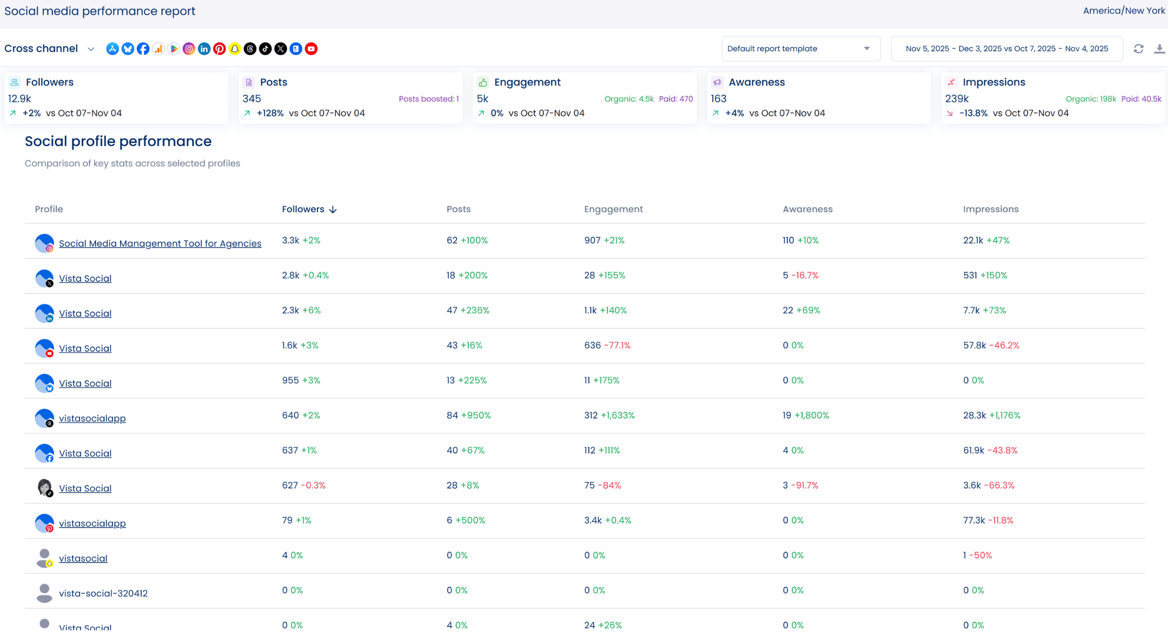 Vista Social’s reports now include a grid view of all your clients’ selected profiles, giving you a top-level view of key metrics across profiles for easy tracking and comparison.