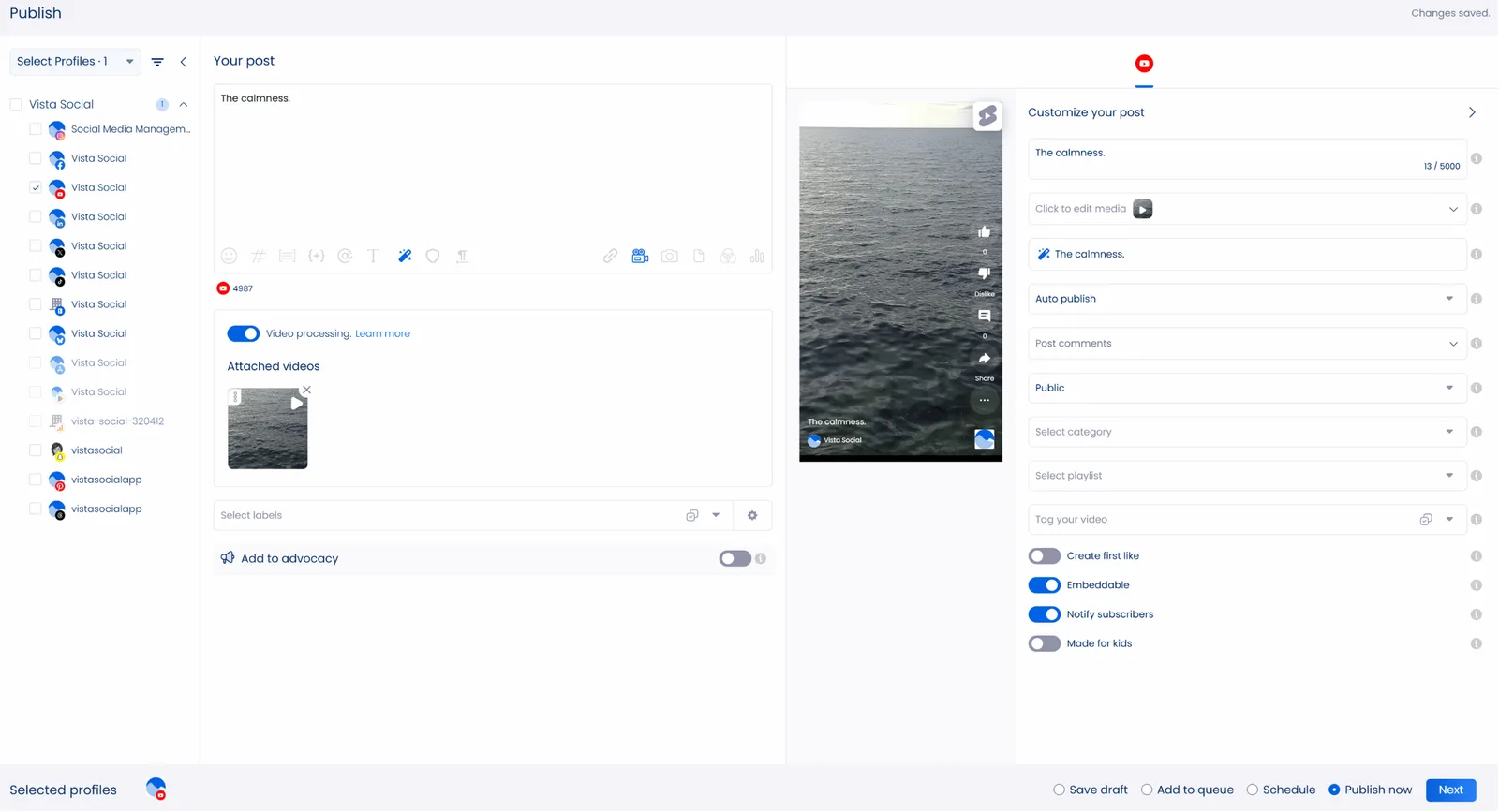 Schedule your clients’ YouTube videos to auto-post with Vista Social’s easy-to-use Publisher.