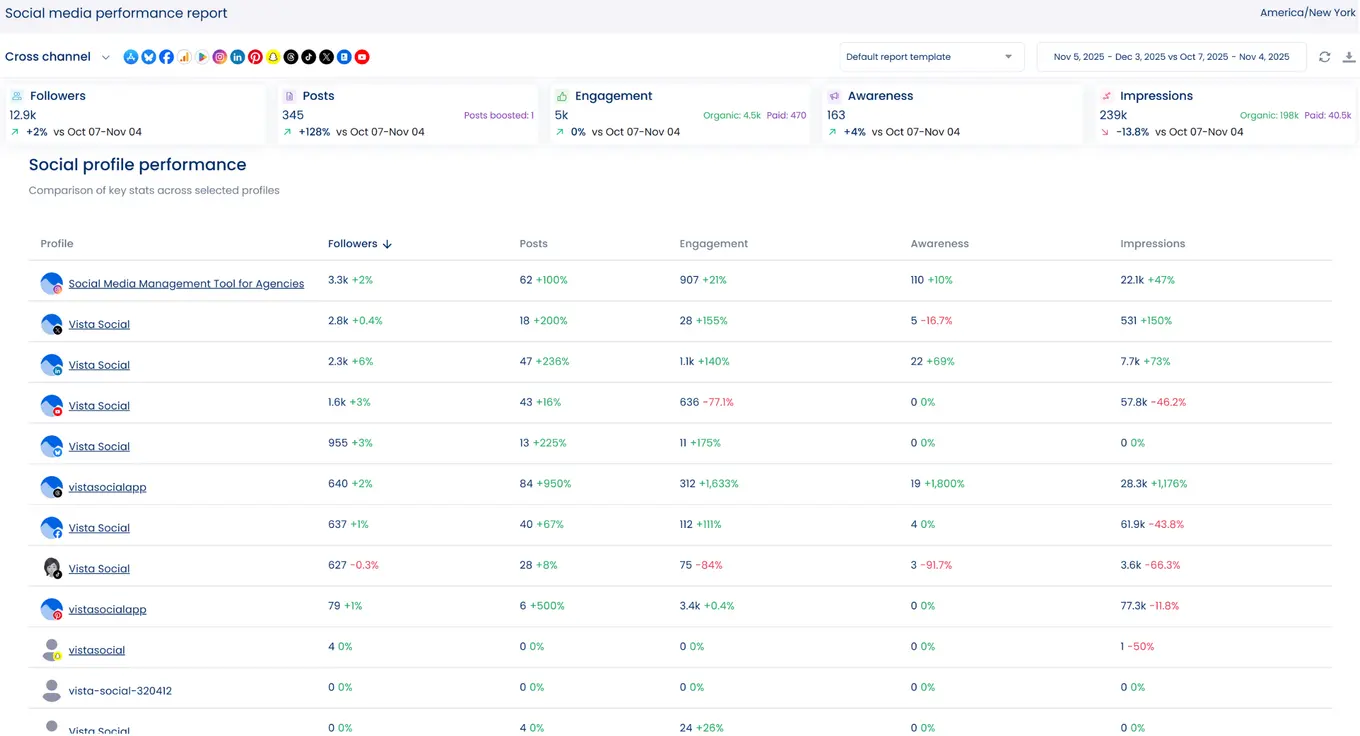 Vista Social’s reports now include a grid view of all your clients’ selected profiles, giving you a top-level view of key metrics across profiles for easy tracking and comparison.