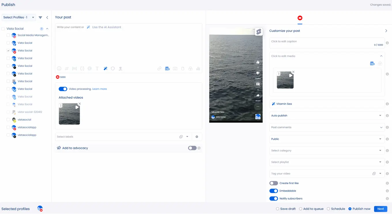 Leverage reliable YouTube management tools for business with Vista Social to make your life as a social media manager much easier. Create a Vista Social account now to harness the power of a robust social media management platform.