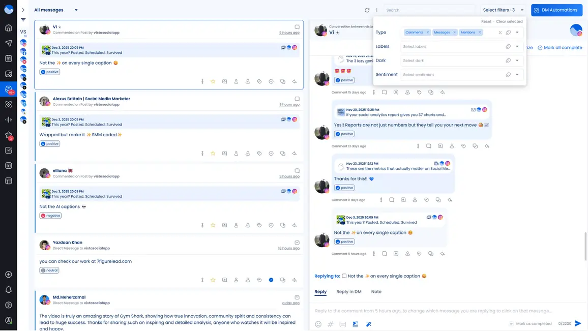 Another handy Vista Social feature is the Social Inbox. It helps you manage your clients’ subscribers and their comments efficiently. Filter everything that comes through your clients’ feeds so you can respond to subscribers right away.