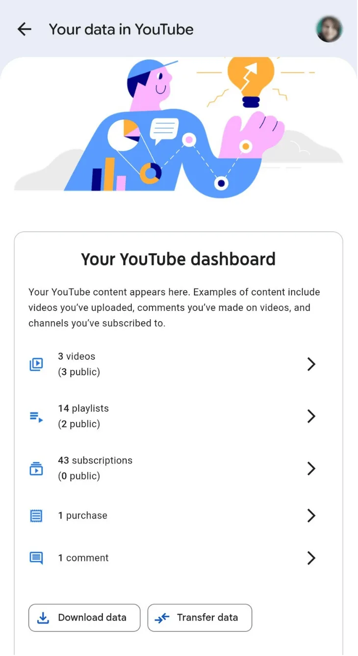 - Tap your client’s YouTube account profile icon or photo in the top right corner and select Your data in YouTube.
